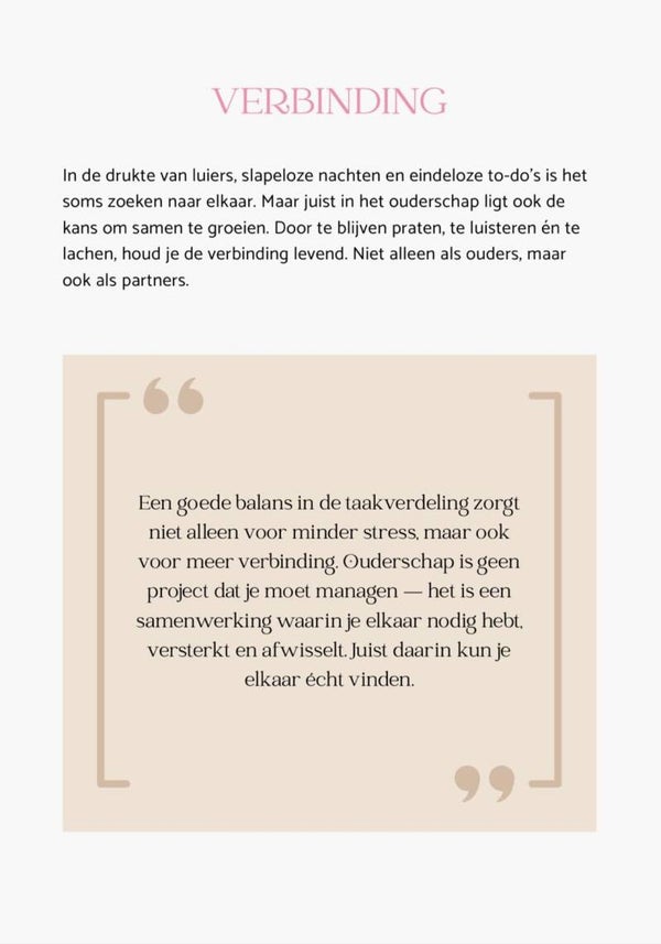 Het werkboek is opgebouwd uit vier hoofdstukken: jij als persoon, je omgeving, jouw rol als ouder en jij & je partner. Het werkboek bestaat uit 50 pagina's vol met informatie, reflectievragen, praktische opdrachten en ruimte voor je persoonlijke doelen.