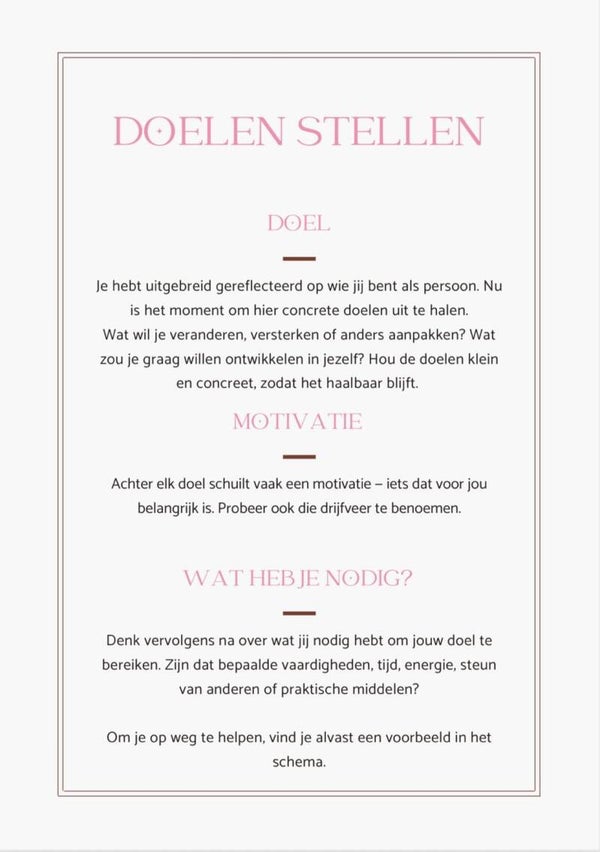 Wil je graag 1-1 aan de slag met de inzichten en doelen na het invullen van het werkboek? Dat kan natuurlijk. Het werkboek is een fijne opstap om inzicht te krijgen in waar je vastloopt en hoe je dat kan accepteren, omarmen of stappen te nemen om te veranderen. Neem contact op om 1-1 aan de slag te gaan!